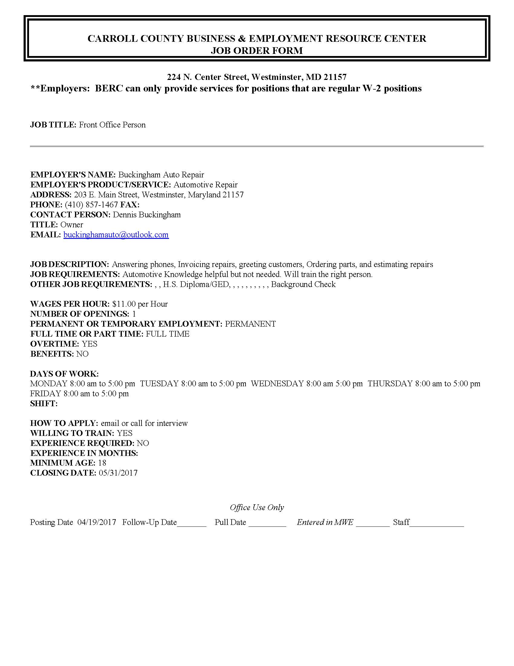 Carroll County Workforce Development On Twitter Job Opportunity With Buckingham Auto Repair Front Office Worker Full Time Monday Through Friday Jobs Westminstermd Carrollcounty Job Https T Co Hljbmqg4xy Twitter